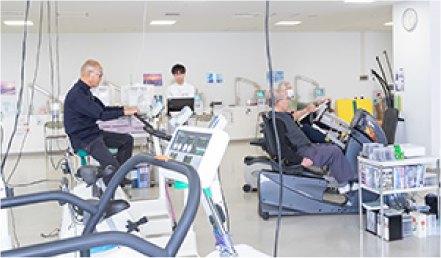 当院西館2階に心臓リハビリテーション専用の施設を有しております。2人の理学療法士が常駐し心電図モニターなどで患者さん毎の体調を管理しながら心肺機能の向上、体力の向上を図っています。日常生活を送ることに自信を付けていただき、心疾患の再発・予防も図っています。