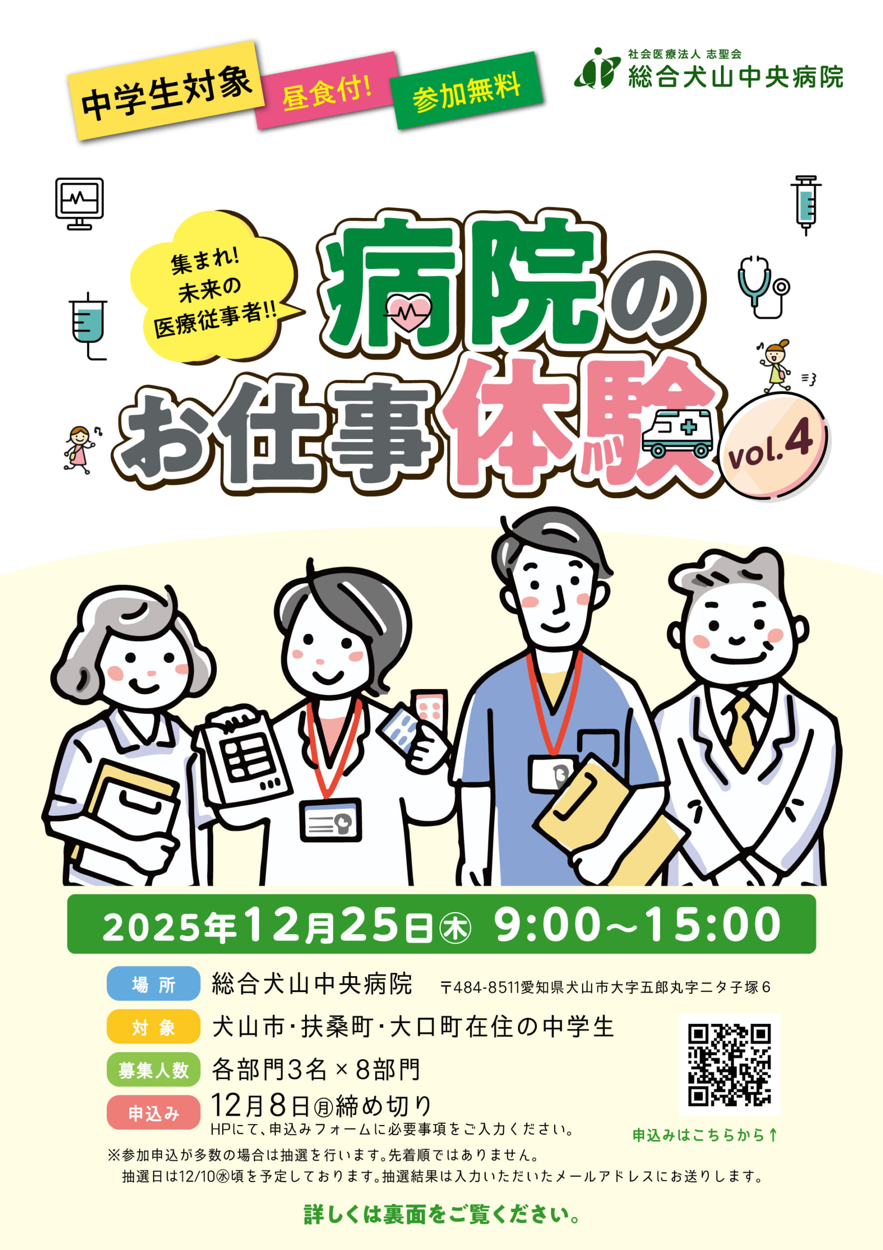 【中学生対象・参加費無料】病院のお仕事体験開催!!医療従事者になってみよう!vol.4【12月25日(木)】