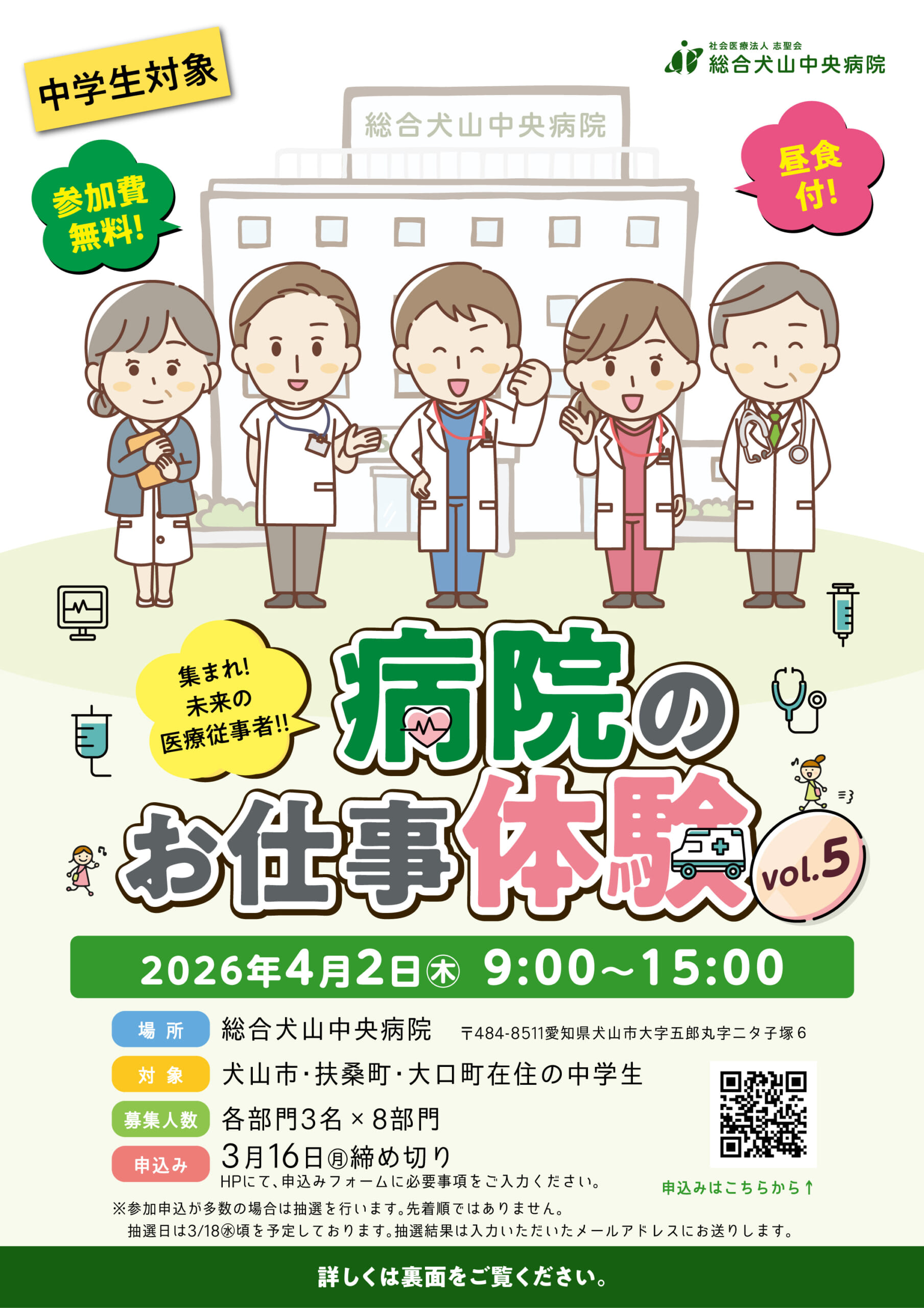 4月2日(木)、「集まれ!未来の医療従事者」お仕事体験イベントvol.5を開催します。医師、看護師、放射線技師、薬剤師、栄養士、臨床検査技師、理学療法士など、病院で働く多彩な職業を一日で体験できるチャンスです!このイベントでは、実際の医療現場でどのような仕事が行われているのかを体感し、自分に合った医療の仕事を見つけることができます。将来、医療従事者を目指している君にとって、貴重な学びと発見がいっぱい!白衣を着て、医療の最前線に立つ自分を想像してみてください。参加は無料、定員が限られているので、早めにお申し込みを。さあ、一歩踏み出して、未来の医療を体験しよう!